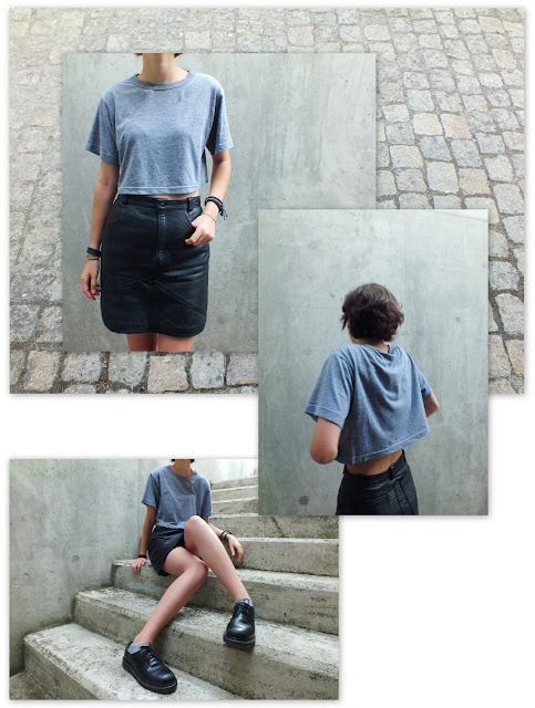 1. Cut straight through a pair of trousers turning it into some biker shorts, which you can wear later with or without the skirt.